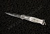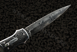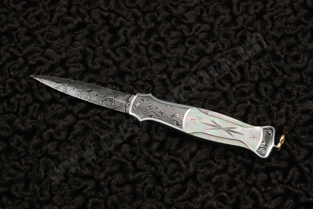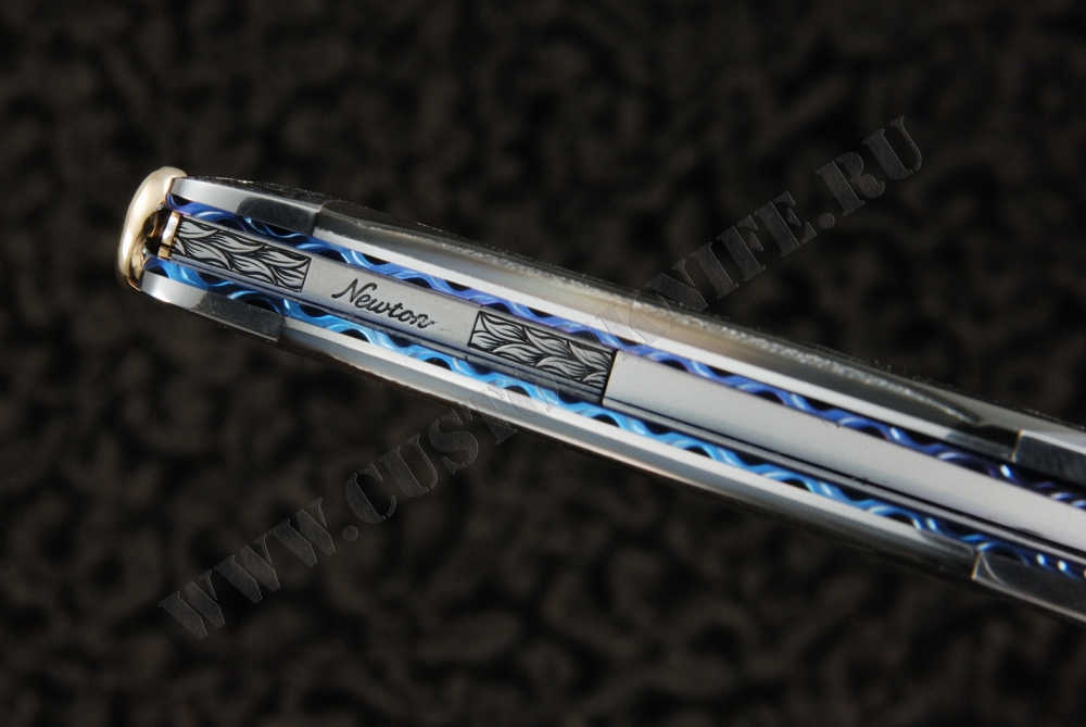 Нож потрясающей красоты. Его общая длина составляет 7’’ и он прекрасно отделан. Это копьеобразный обоюдоострый клинок, который великолепно ведет себя в действии. Лезвие отлично отцентровано и при закрытии очень плотно садится в гнездо. Клинок и больстеры выполнены из дамасской стали Дэвина Томаса (Devin Thomas), вытравленной и покрытой черным лаком, благодаря которому рисунок получился очень четким. Накладки рукояти из черного перламутра, крайне точно выгравированные в центре и гравированные в пунктирной манере по краям, создают текстуру и глубину. Нож производит потрясающее впечатление благодаря не только своим внешним видом, но и эксплуатационными качествами. Это творение Ларри Ньютона является мечтой многих коллекционеров и станет жемчужиной любой коллекции.