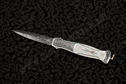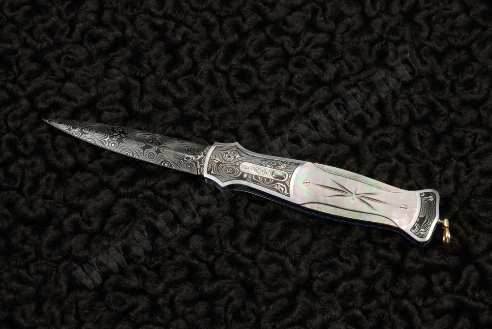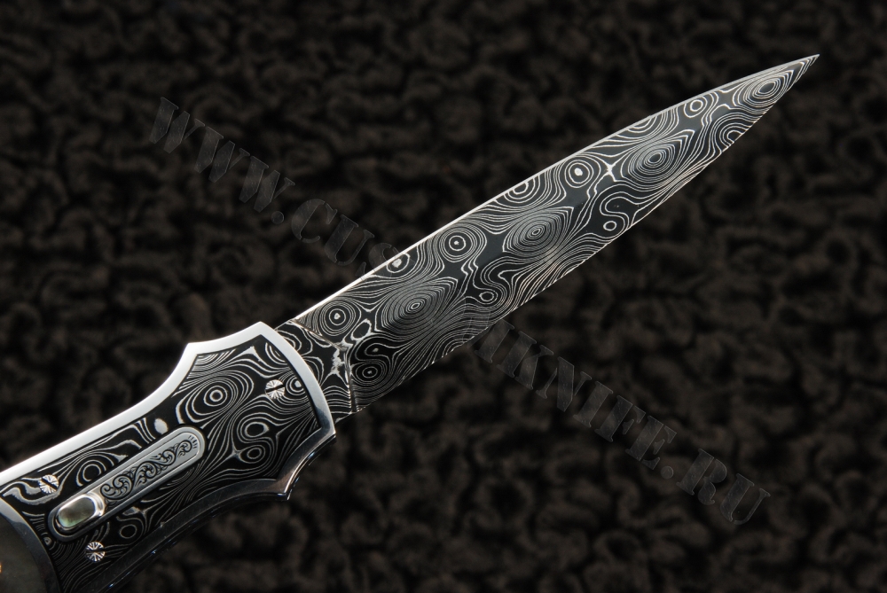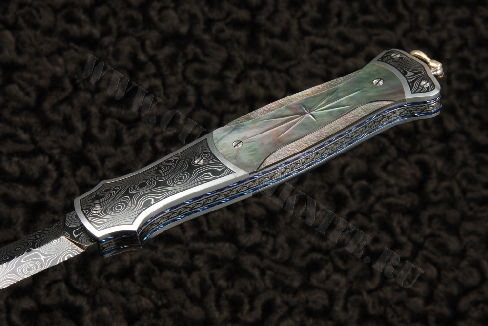 - материал рукояти: накладки – черный перламутр, больстеры – дамасская сталь, рама – анодированный титан