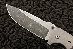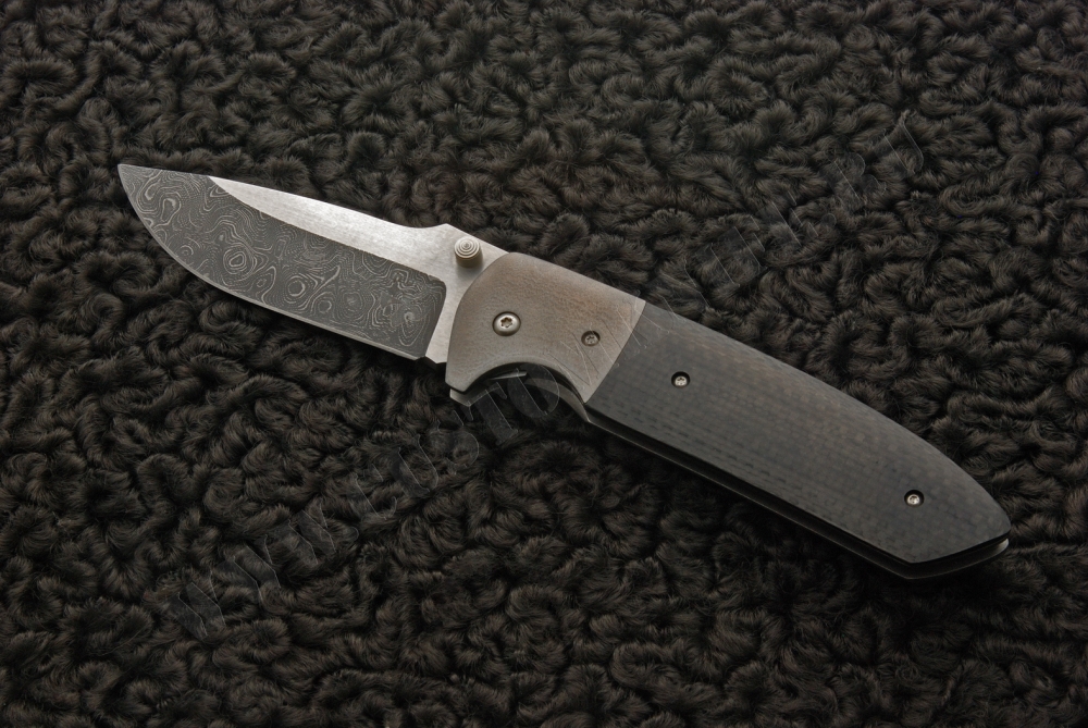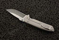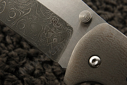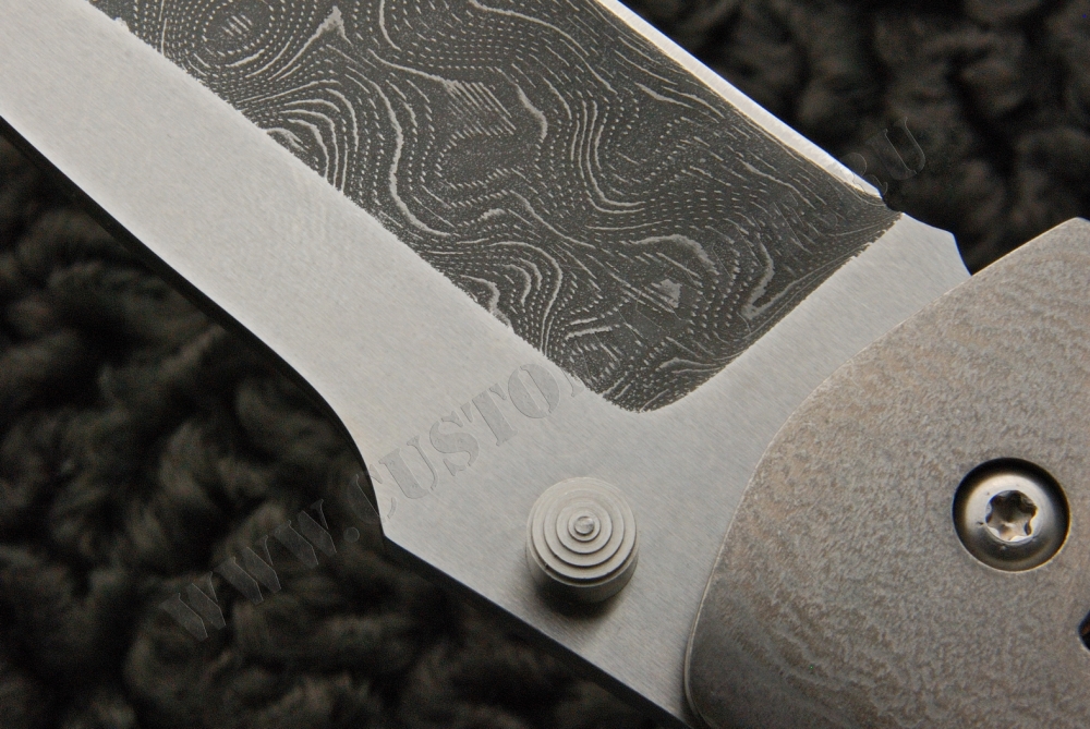 Лес Джордж проделал огромную работу, чтобы собрать из дамаска, титана свой нож Rockeye. Клинок получился двуцветным благодаря фрезерованным поверхностям, однако рисунок дамаска продолжается и на них.
