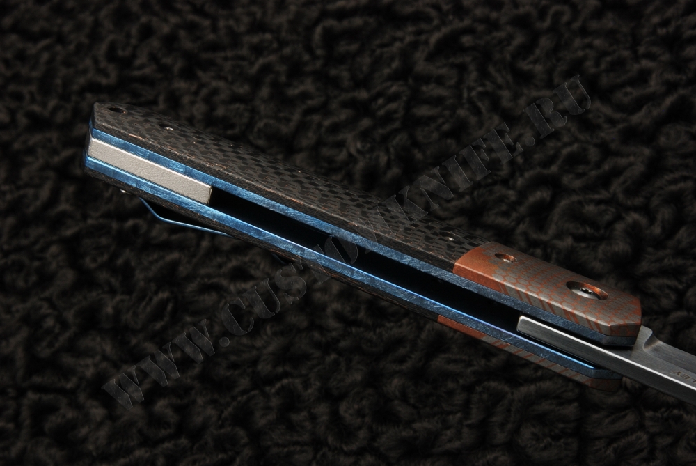 Нож Kwaiken не только прекрасно лежит в руке, но и выглядит необычно, благодаря материалам, из которых изготовлена рукоять, а также узорам больстеров и накладок. В качестве материала накладок использовано углеродное волокно темного цвета с золотистыми переливами. Больстеры рукояти изготовлены из ниобия, с рисунком в форме пчелиных сот, что придает данному ножу неповторимый вид. Своеобразие ножу также придают лайнеры и клипса голубого оттенка.