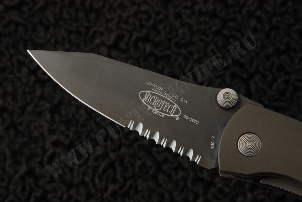 На клинке имеется клеймо компании Microtech, а также серийный номер ножа — 08 |2002. Клипса для переноски сделана из стали с глянцевой отделкой.