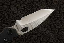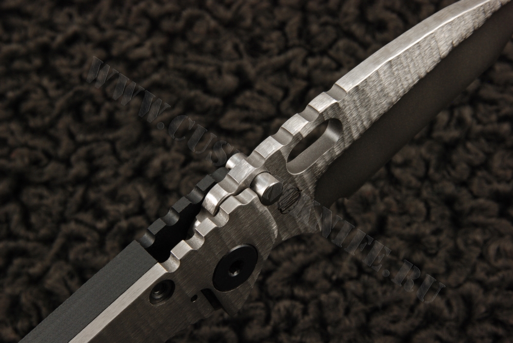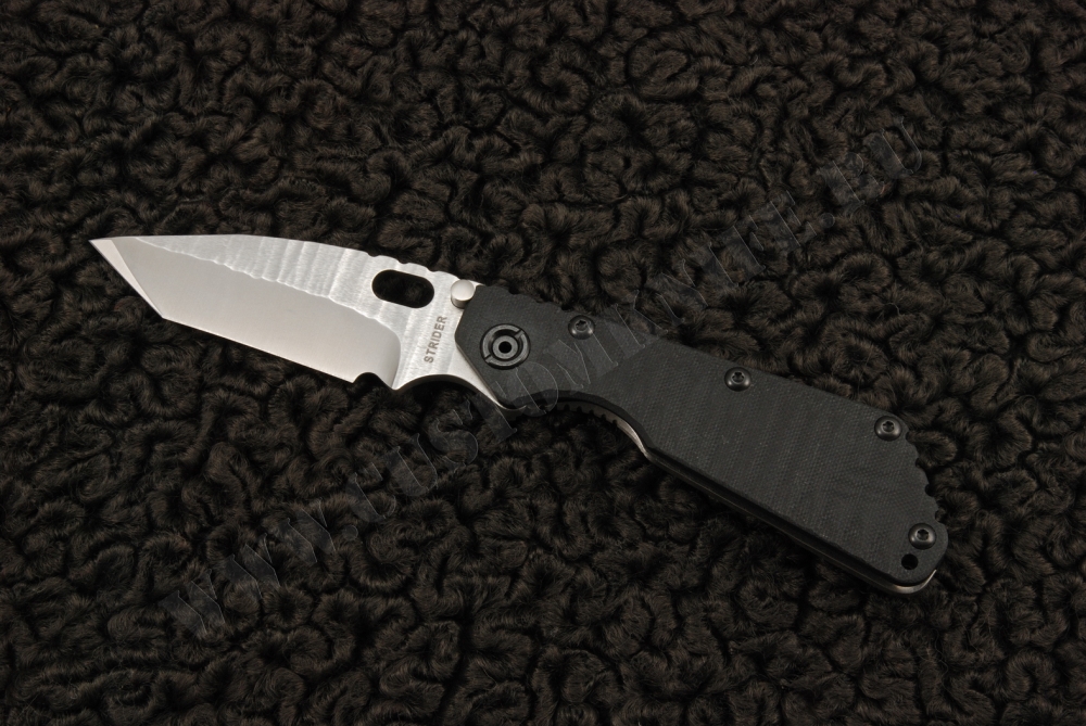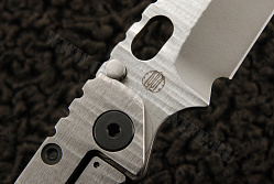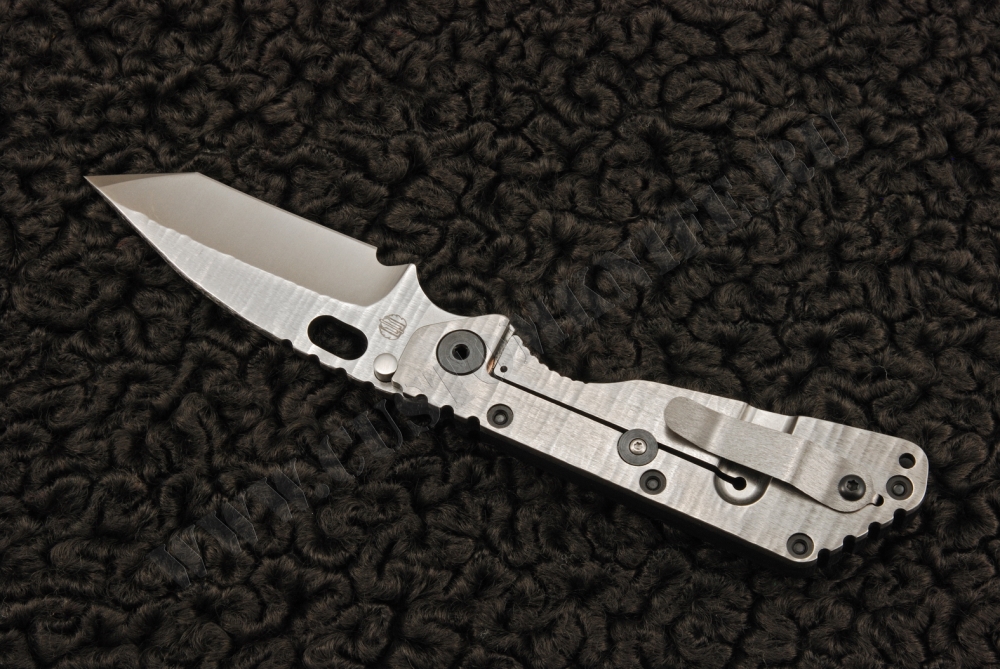 Особенностью этой модификации SMF от Страйдера является то, что клинок этого ножа имеет вид танто. Особенностью конкретно этого экземпляра является тот факт, что и клинок, и титановая рукоять обработаны по технологии «sandblast», cracked ice. На обухе рукояти и самого клинка имеются насечки для лучшего контроля ножа. С обратной от фрейма стороны рукоять выполнена из структурированного G10. Сам фреймлок очень надежен — нож стабилизатором, разработанным Риком Хиндерером. Благодаря этой детали, фрейм прослужит гораздо дольше. В целом, очень интересный коллекционный экземпляр.