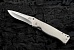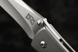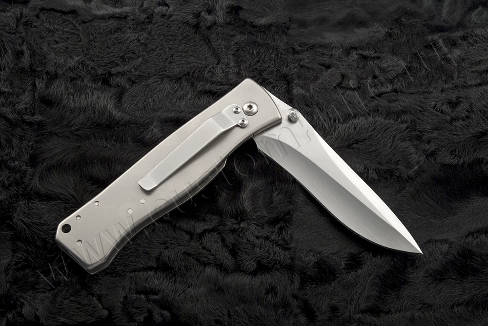 MODEL 2, 4" double hollow ground fighter style blade, titanium frame and lock, ATS-34, hand rubbed satin finish on blade, thumb stud opener, titanium back spacer. The titanium frame has a bead blast finish. |